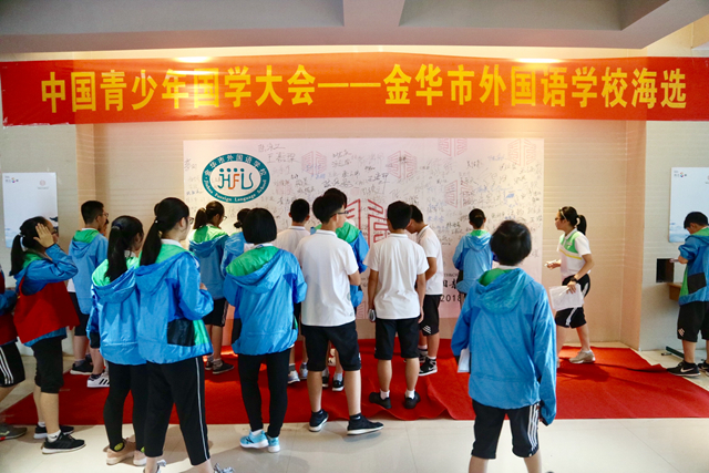 近日,“中國青少年國學大會”金華市外國語學校海選在金外初中部舉行。“中國青少年國學大會”是一個首次跨越六個年級的國學大賽場,分為海選、復賽以及全國總決賽三大階段。本次比賽采取班班組組對抗制,包含古文、詩詞、國學經典、國藝、民俗、民風等內容,全校共有兩百余名選手參賽,展現國學知識涵養。